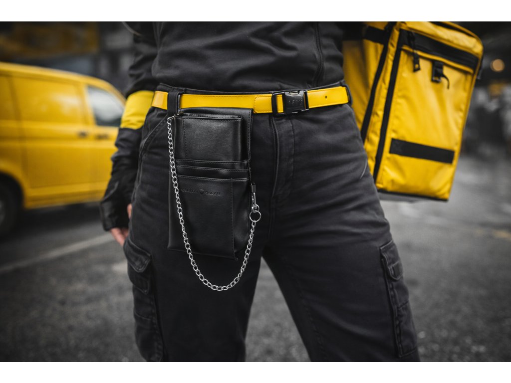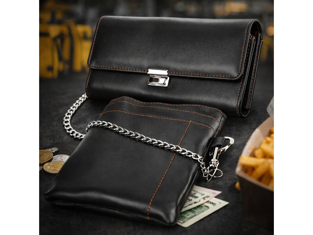 Tato peněženka v černém provedení a praktickým pouzdrem výborně poslouží každému kurýrovi nebo komukoli, kdo každý den pracuje se spoustou bankovek a mincí. Peněženka disponuje praktickým uzavíracím mechanismem, díky kterému se nemusíte obávat o náhodné otevření peněženky. Tu odemknete posunutím kovového obdélníku směrem dolů a uzamknete posunutím tohoto posuvného tlačítka směrem nahoru. Díky přiloženému pouzdru, které se navléká na opasek, je tak možné mít peněženku vždy vedle sebe. Obavy z ukradení peněženky také nemusí vznikat, jelikož pouzdro a peněženka jsou spojeny stylovým řetízkem s karabinkou. K dispozici je až 8 přihrádek na bankovky, jedna kapsa na zip na mince a dvě přídavné přihrádky na pouzdře pro další cenné papíry a doklady.